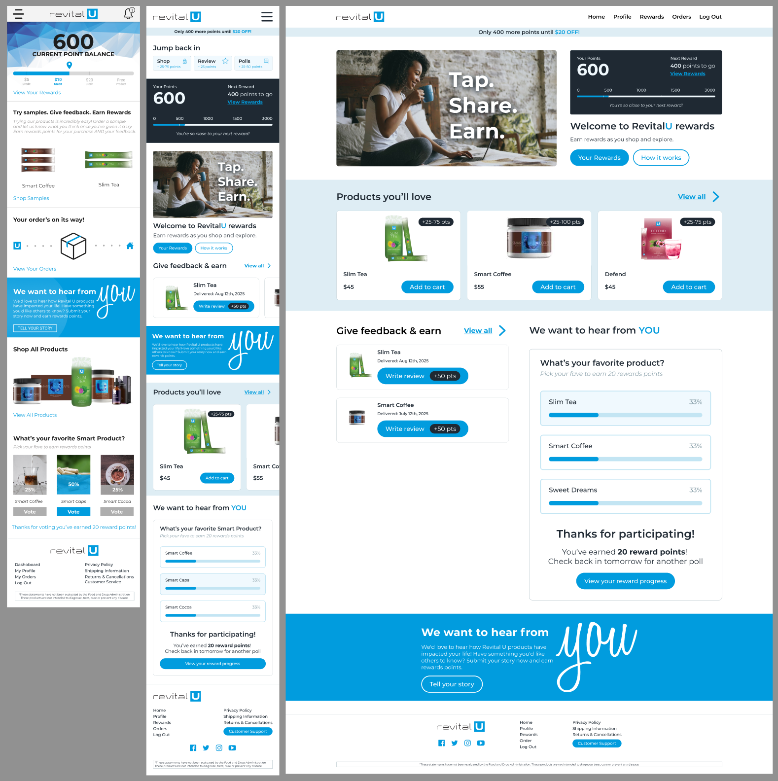 I kept the core concept while refreshing the styling within their brand guidelines and aligning it with their other media. I also moved points-related modules to the profile page and cut back on home page CTAs to focus on point-earning actions. This helped simplify the overall flow and made the experience feel more intuitive and easier to navigate.
