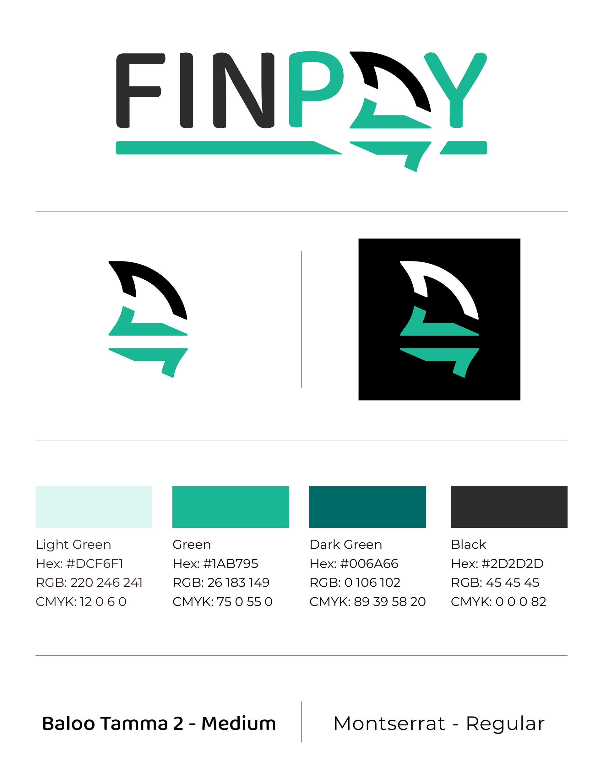 The color palette combines the shades of the ocean and the US dollar. The mark combines a fin, a transfer icon, and the letter A in a single shape. The typeface ties it all together by mirroring the same angles and curves to create a cohesive visual.